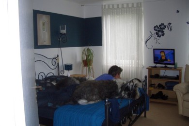 Dann haben wir drei schön gemeinsam auf dem Bett gelegen und fern geschaut. So stellen WIR uns einen gemütlichen Freitagabend vor! Nur das Staubsaugergeräusch hat ein bisschen gestört - aber naja - da kann man ja den Ton vom Fernseher lauter machen ;-)).