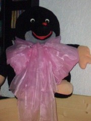 Setzen die mir so´n schwarzes Ungetüm auf den Rand der blöden Kiste, binden dem ´nen pinken Schal um und meinen damit wäre ich versöhnt ... Wie sieht der Typ denn aus? Also ich habe ihn Bruce getauft!!!!
