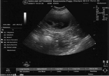 Dann hat die Tierärztin so ein Teil genommen, was aussieht wie ein Scanner und ist damit über meinen Bauch gefahren. Peggy, Frauchen und Herrchen haben ganz gespannt auf den Monitor neben uns geschaut und auf einmal sagte die Tierärztin:
