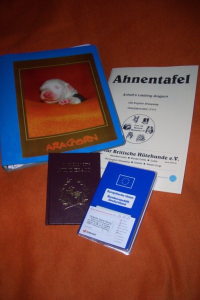 Sein Spielzeugauto, das er in der ersten Nacht mich und seine Geschwister riechen kann und nicht so traurig ist. Seine Ahnentafel, seinen Impfausweis ... oh je ... wo war der gleich noch?? Haben wir doch gestern erst bekommen. Muss ich Peggy fragen ...