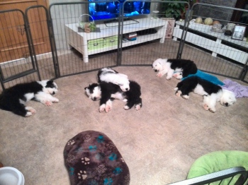 Am Mittwoch war die Sibylle, Bélas Frauchen, da und wir sind alle nach Bernau zum "Augenarzt" gefahren. Die erste lange Autotour wurde von allen Welpen mit Bravour gemeistert .